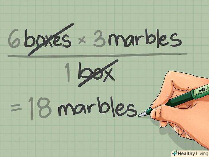 Записуйте одиниці виміру після кожної величини.у текстових завданнях набагато простіше розпізнати помилку, якщо записувати одиниці виміру після кожного значення. Пам'ятайте, що величини з одними і тими ж одиницями виміру в чисельнику і знаменнику скорочуються. Скоротивши вираз, Ви отримаєте правильну відповідь.- Приклад: дано 6 коробок, в кожній третій коробці знаходиться 9 кульок. Скільки всього кульок?