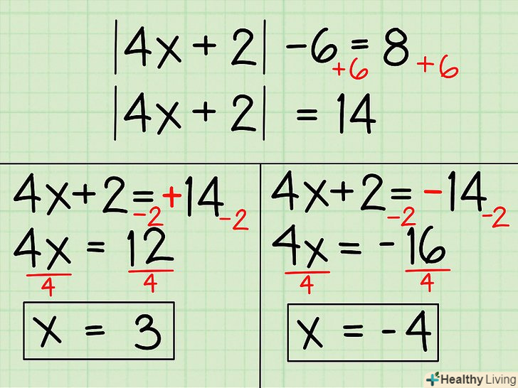 Вирішіть алгебраїчне рівняння, що містить абсолютні величини.абсолютна величина числа-це його невід'ємне значення. Наприклад, абсолютне значення -3 (позначається як |3|) дорівнює 3. Для вирішення таких рівнянь відокремте абсолютне значення і знайдіть два значення «х» - одне значення при позитивному значенні виразу, укладеному в вертикальні дужки, а інше значення при негативному значенні виразу, укладеному в вертикальні дужки. Ось як це зробити:- Спочатку відокремте абсолютну величину, а потім опустіть вертикальні дужки. Зараз ви знайдете " х " при позитивному значенні виразу, укладеному в вертикальні дужки: