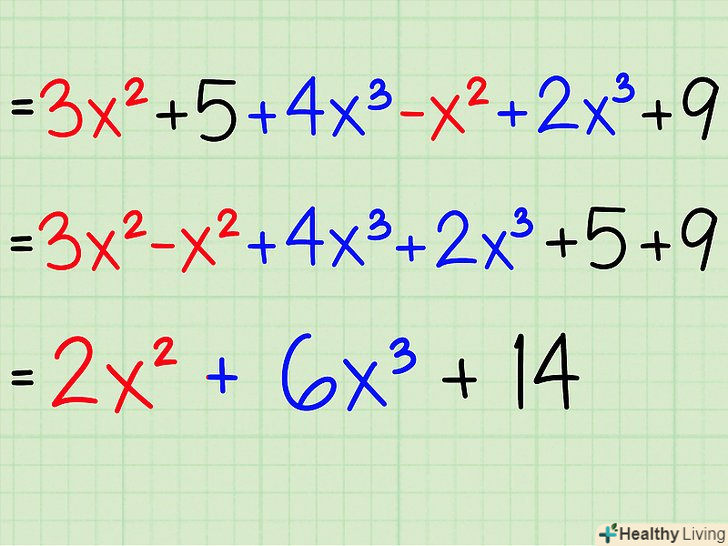Навчіться приводити подібні члени.це означає Скласти або відняти члени одного порядку. Тобто члени зі змінною x2 можуть бути складені разом або відняті один з одного, члени зі змінною x3 можуть бути складені разом або відняті один з одного, і вільні члени (члени без змінної) можуть бути складені разом або відняті один з одного. Наприклад:- 3x2 + 5 + 4x3 - x2 + 2x3 + 9 =