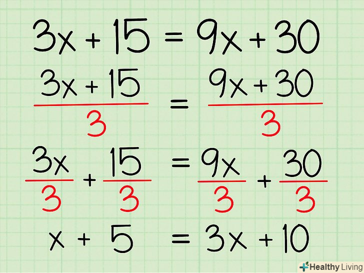 - Тут кожен коефіцієнт ділиться на 3. Винесіть це число за дужки, розділивши кожен член на 3. Потім розділіть обидві частини рівняння на 3, щоб скоротити винесені за дужки 3.