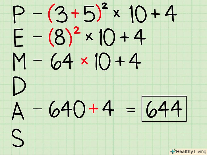 Запам'ятайте порядок виконання математичних операцій: дужки, ступінь, множення, ділення, додавання, віднімання. Ось приклад того, як дотримуватися порядку операцій:- (3 + 5)2 x 10 + 4