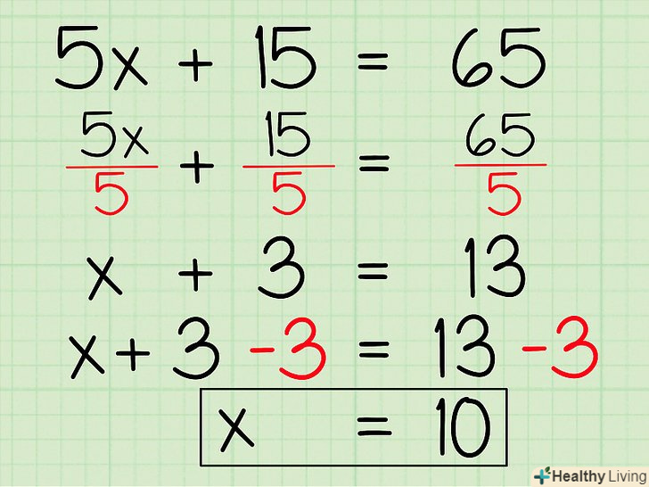 Навчіться обґрунтовувати змінну. при вирішенні алгебраїчного рівняння ви повинні відокремити змінну (найбільш часто позначається як "х") на одній стороні рівняння. Ви можете відокремити змінну через ділення, множення, додавання, віднімання, Витяг кореня або інші операції. Після того, як ви відокремили «х», ви вирішили рівняння. Ось як це робиться:- 5x + 15 = 65