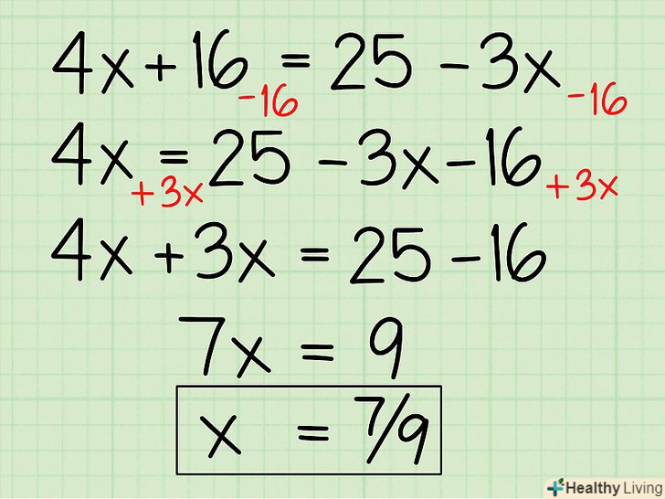 Вирішіть лінійне алгебраїчне рівняння.Лінійні алгебраїчні рівняння включають вільні члени і змінні першого ступеня. Для вирішення таких рівнянь використовуйте операції множення, ділення, додавання і віднімання, щоб відокремити змінну «х». Ось як це робиться:- 4x + 16 = 25 - 3x