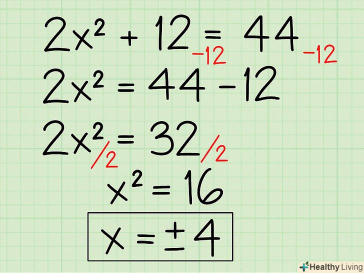 Вирішіть алгебраїчне рівняння зі змінною другого порядку.у такому рівнянні необхідно відокремити змінну, а потім витягти квадратний корінь одночасно зі змінної і з виразу на іншій стороні рівняння. Ось як це робиться:- 2x2 + 12 = 44