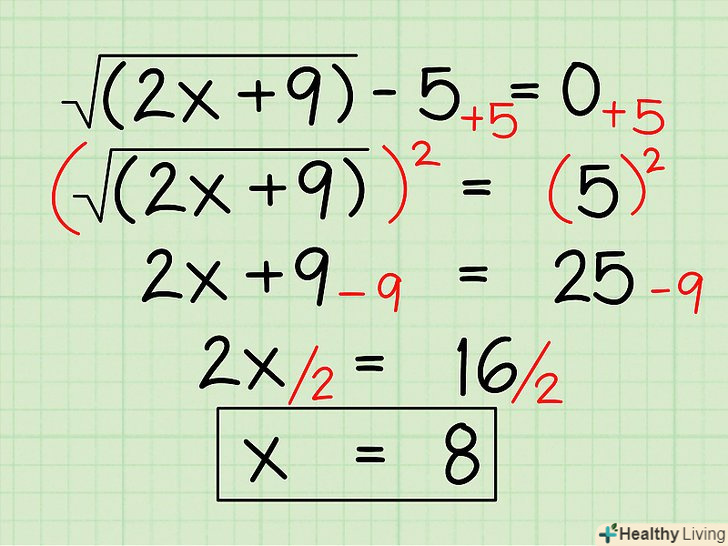 - Потім зведіть в квадрат виразу, що знаходяться з обох сторін рівняння (щоб позбутися від кореня):