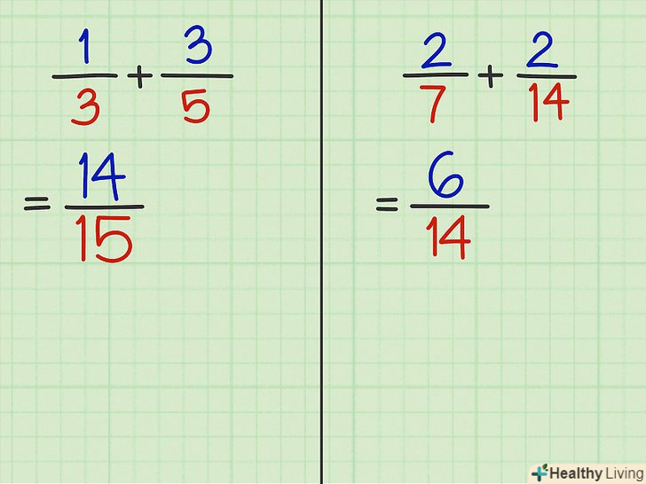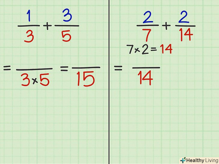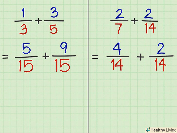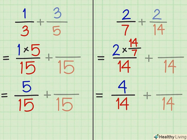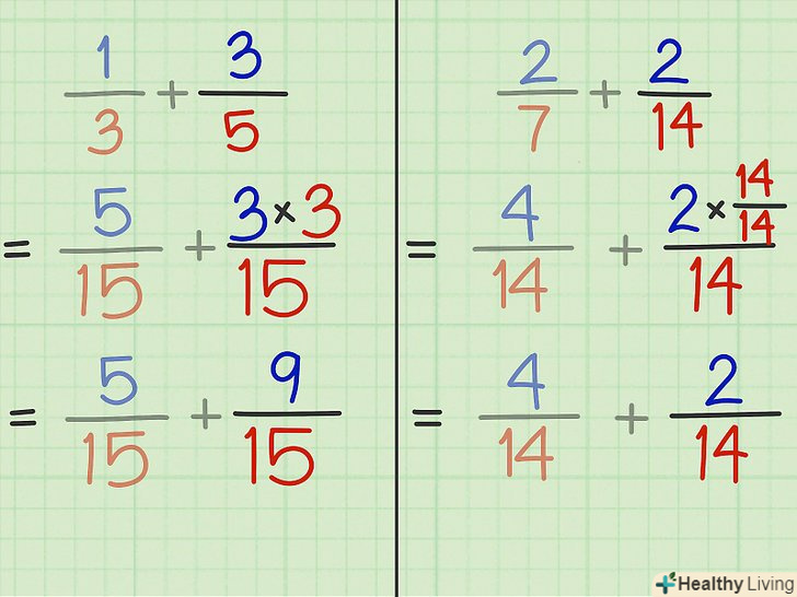 Помножте чисельник і знаменник першого дробу на знаменник другого дробу.зверніть увагу, що в цьому випадку значення вихідної дробу не зміниться.- Приклад 3: 1/3 x 5/5 = 5/15.