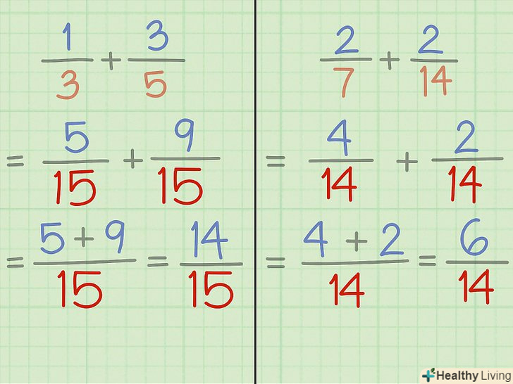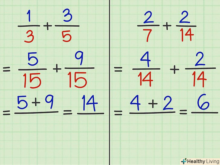 Запишіть отримані дроби. Ми ще не склали їх, а просто помножили кожен дріб на 1, щоб привести їх до спільного знаменника.- Приклад 3: 1/3 + 3/5 = 5/15 + 9/15