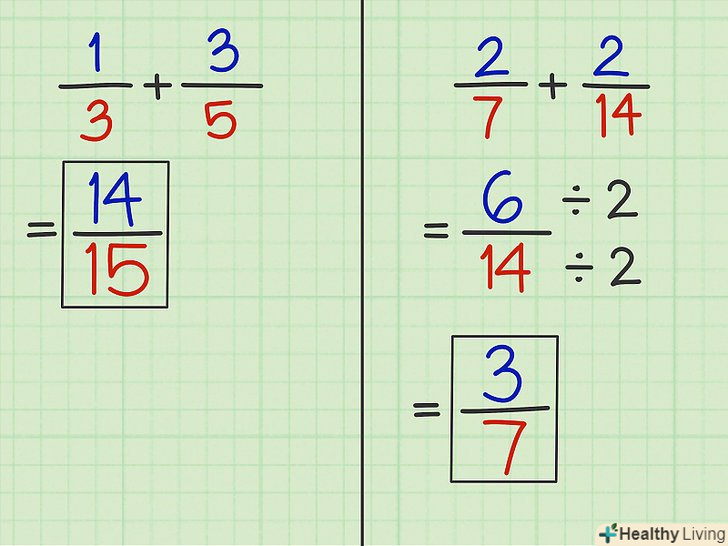 Запишіть кінцеву дріб на основі обчисленого чисельника і загального знаменника.- Приклад 3: 1/3 + 3/5 = 14/15