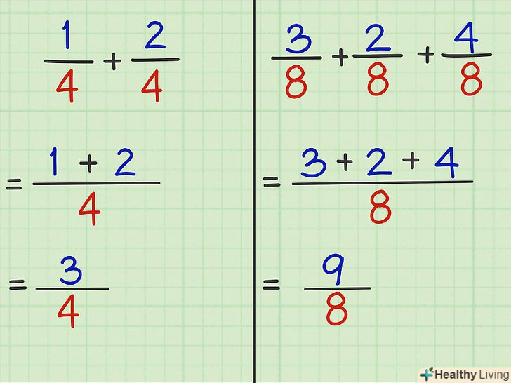 - Приклад 2: 3/8 + 2/8 + 4/8. Тут числа "3" « " 2 " і " 4 " є чисельниками, тому 3 + 2 + 4 = 9.