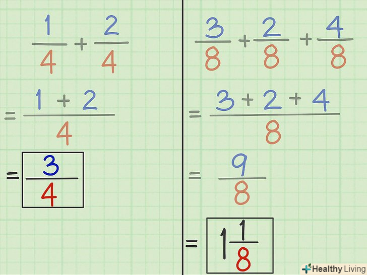 Запишіть кінцеву дріб.знайдену суму чисельників запишіть в чисельнику нового дробу. Тепер запишіть однаковий знаменник у знаменнику нового дробу, тобто вихідний знаменник не змінюється.- Приклад 1: 3 — це чисельник, а 4-знаменник кінцевої дробу. Таким чином, 1/4 + 2/4 = 3/4.