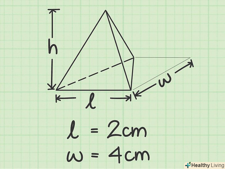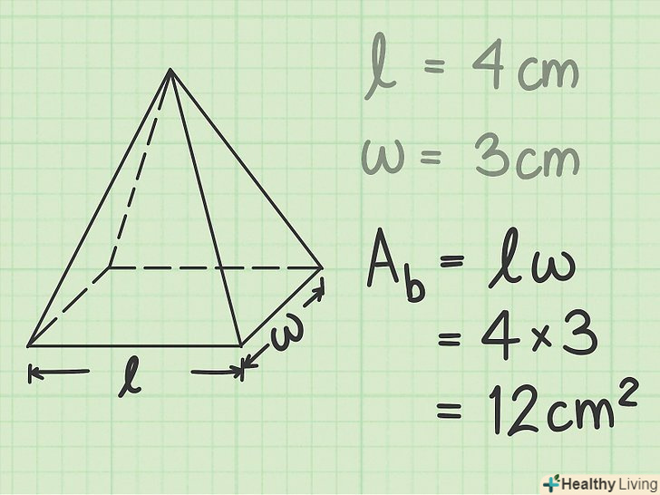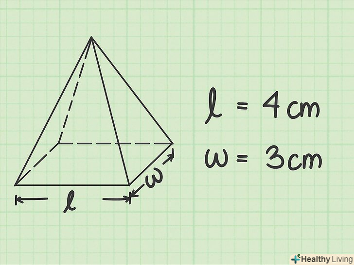 Знайдіть довжину і ширину підстави.для прикладу візьмемо піраміду, довжина основи якої дорівнює 4 см, а ширина — 3 см.якщо підстава має форму квадрата, методика розрахунку буде такою ж, тільки ці сторони будуть рівні. Запишіть вимірювання.[1]- Згідно з формулою,