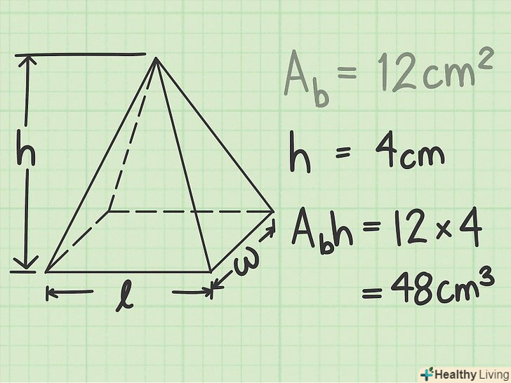 Помножте площу основи на висоту. у нашому прикладі площа основи дорівнює 12 см2, а висота піраміди — 4 см, так що потрібно помножити 12 см2 на 4 см.- Згідно з формулою,