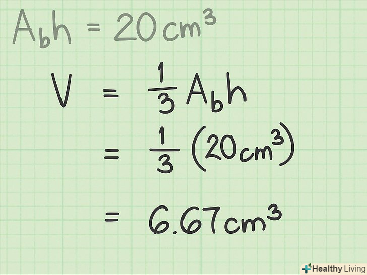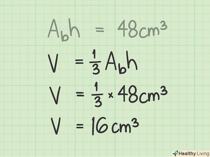 Отриманий результат помножте наабо, що те ж саме, розділіть на 3.Пам'ятайте, що обсяг вимірюється в кубічних одиницях.[4]