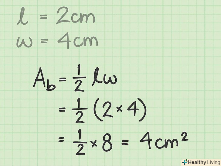 Знайдіть довжину і ширину підстави.вони повинні бути перпендикулярні один одному, інакше цей спосіб не підходить. Їх також можна вважати підставою і висотою трикутника. Для прикладу візьмемо піраміду з шириною основи 2 см і довжиною 4 см.[5]- Якщо довжина і ширина не перпендикулярні і висота трикутника невідома, існують інші способизнайти площу трикутника