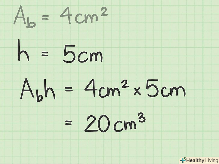 Помножте площу основи на висоту піраміди.у нашому прикладі площа основи дорівнює 4 см2, а висота — 5 см.- Згідно з формулою,