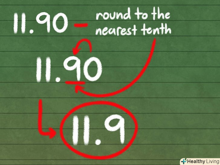 Округліть 11,90 до десятих.наявність нуля може трохи збентежити вас, але згадайте, що нуль менше п'яти. Дивіться рішення нижче.- Знаходимо місце розташування десятих (11,90).