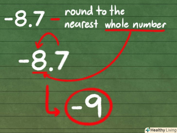 Округліть -8,7 до цілих. Не лякайтеся наявності негативного знака, округлення негативних чисел абсолютно однаково з округленням позитивних.- Знайдіть цілі (-8,7)