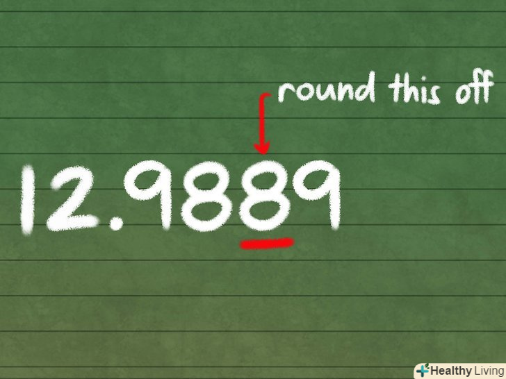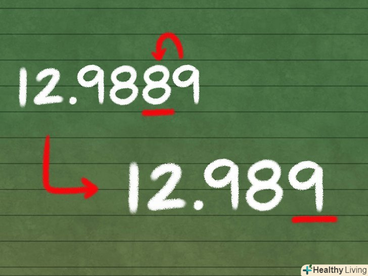 Подивіться на цифру праворуч від необхідного місця округлення.тепер слід дізнатися цифру, яка стоїть праворуч від місця, до якого ви робите округлення. Залежно від цієї цифри ви будете виробляти округлення в більшу або в меншу сторону (вгору або вниз).- У взятому раніше прикладі числа (12,9889) необхідно зробити округлення до тисячних (12,9889), тому тепер слід подивитися на цифру праворуч від тисячної частки, а саме на останню дев'ятку (12,9889).