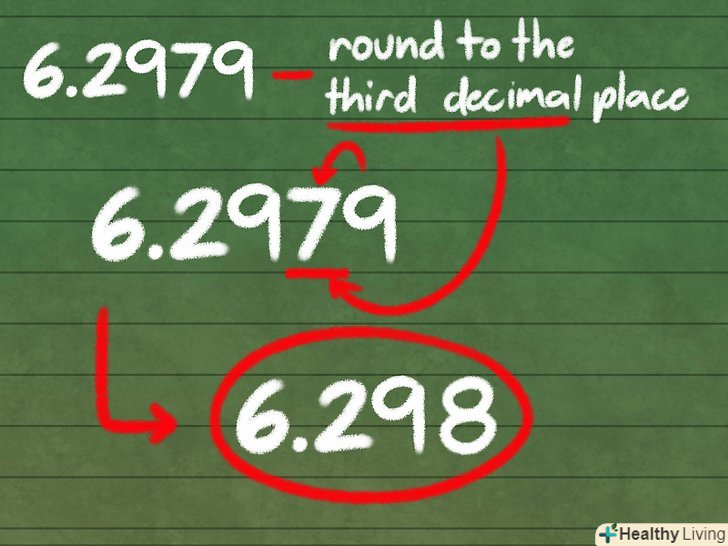 Округліть 6,2979 до третього знака після коми.Пам'ятайте, що це означає Те ж саме, що і округлення до тисячних. Дивіться рішення нижче.- Знаходимо місце розташування третього знака після коми (6,2979).