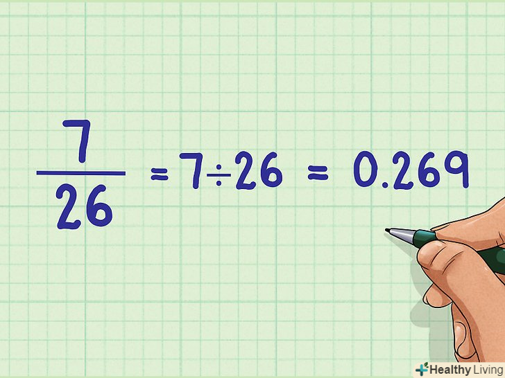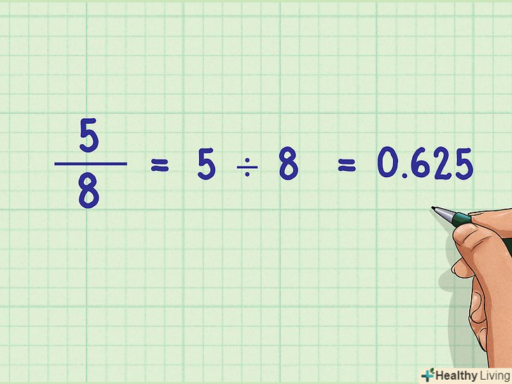 Якщо потрібно, Перетворіть дріб.іноді дріб можна записати у вигляді цілого числа, а не звичайного або десяткового дробу. Наприклад, дріб 5/5 легко перетворюється в 1, так як будь-яка дріб, у якій чисельник дорівнює знаменнику, є 1.[3] уявіть пиріг, розрізаний на три частини. Якщо ви з'їсте всі три частини, то ви з'їсте цілий (один) пиріг.- Будь-яку звичайну дріб можна перетворити в десяткову; для цього розділіть чисельник на знаменник. Наприклад, дріб 5/8 можна записати так: 5 ÷ 8 = 0,625.