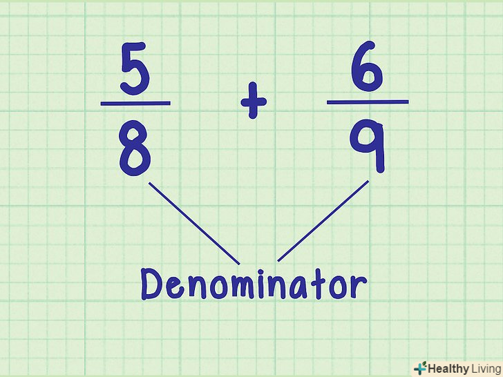 Знайдіть знаменники.у більшості випадків у дробів різні знаменники, тому для того щоб скласти або відняти такі дроби, потрібно обчислити спільний знаменник. Спочатку знайдіть знаменники даних дробів.- Наприклад, в задачі 5/8 + 6/9 знаменники — це числа 8 і 9.