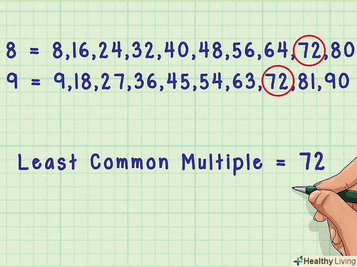 Знайдіть найменше спільне кратне (НОК).загальний знаменник дорівнює найменшому загальному кратному двох знаменників, тобто такому числу, яке ділиться на кожен знаменник.[6] щоб знайти НОК чисел 8 і 9, запишіть кратні числа 8, а потім кратні числа 9:- Кратні 8: 8, 16, 24, 32, 40, 48, 56, 64, 72, 80, 88, 96, 104 і так далі