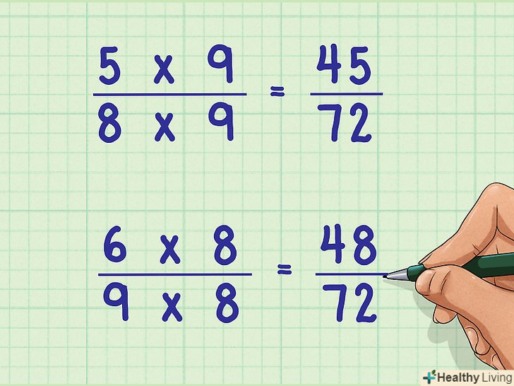 - Дріб 6/9. Щоб привести цей дріб до спільного знаменника, помножте знаменник (9) на 8: 9 х 8 = 72. Тому чисельник (6) теж помножте на 8: 6 х 8 = 48.[7]