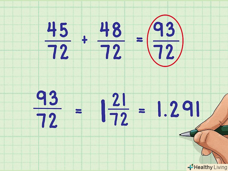 - Тепер у дробів спільний знаменник, і їх можна скласти: 45/72 + 48/72 = 93/72.