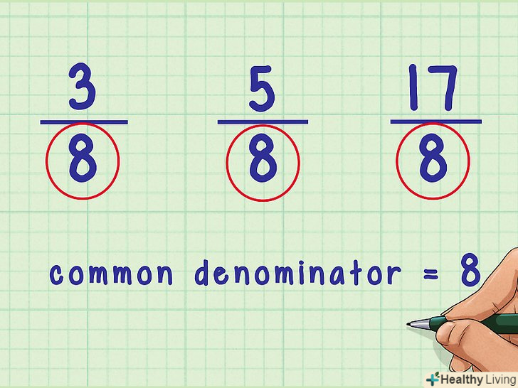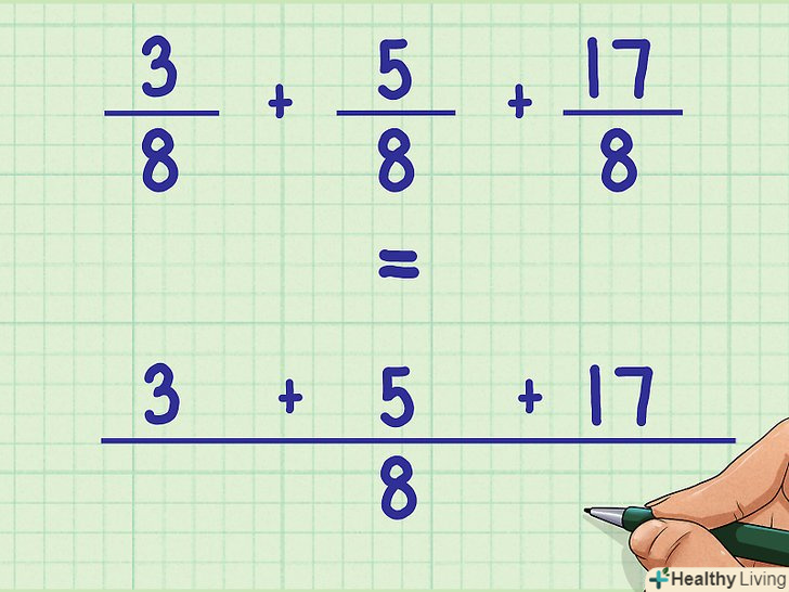 Визначте чисельники. щоб скласти дроби із загальним знаменником, складіть їх чисельники, а результат запишіть над знаменником складаються дробів.[2]- У дробів 3/5 і 2/5 чисельники 3 і 2.