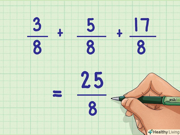 Складіть чисельники.у прикладі 3/5 + 2/5 складіть чисельники 3 + 2 = 5. У прикладі 3/8 + 5/8 + 17/8 складіть чисельники 3 + 5 + 17 = 25.