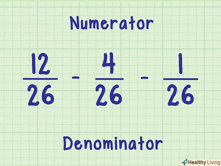 Знайдіть чисельники і знаменники.розглянемо приклад 12/26 – 4/26 – 1/26. Тут:- Чисельники 12, 4, 1