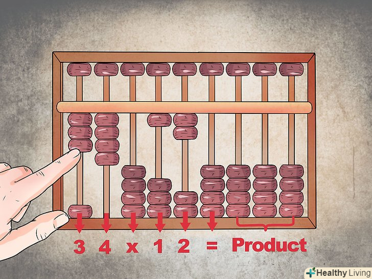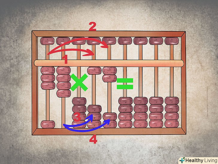 - На рахунках потрібно підняти 3 намистини в крайній лівій колонці, 4 в наступній колонці, далі порожній стовпець, одна намистина вгору, ще один порожній стовпець і ще як мінімум три стовпці для результату множення.