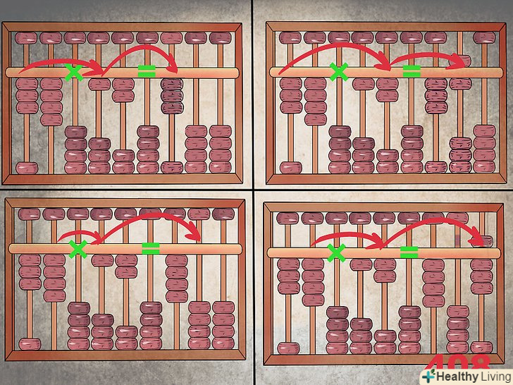 Запишіть твір в правильному порядку. спочатку ви множите 3 на 1, записуючи результат в першій колонці для відповіді, яка в даному випадку буде сьомою колонкою зліва, враховуючи кожну цифру і кожен стовпець-пробіл. Підніміть три намистини в цьому сьомому стовпці. Потім помножте 3 на 2, записавши відповідь у восьмому стовпці. Підніміть верхню намистину і одну нижню намистину в цьому стовпці.- На цьому етапі починаються складності. Коли ви множите 4 на 1, вам потрібно додати результат в восьмий за рахунком стовпець, він же другий стовпець для відповіді. Твір 4 і 1-це 4, і, так як ви додаєте 4 до 6 в цьому стовпці, вам необхідно перенести одну намистину в першу колонку для відповіді, отримавши 4 в сьомій колонці і 0 в восьмий.