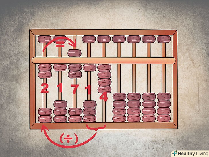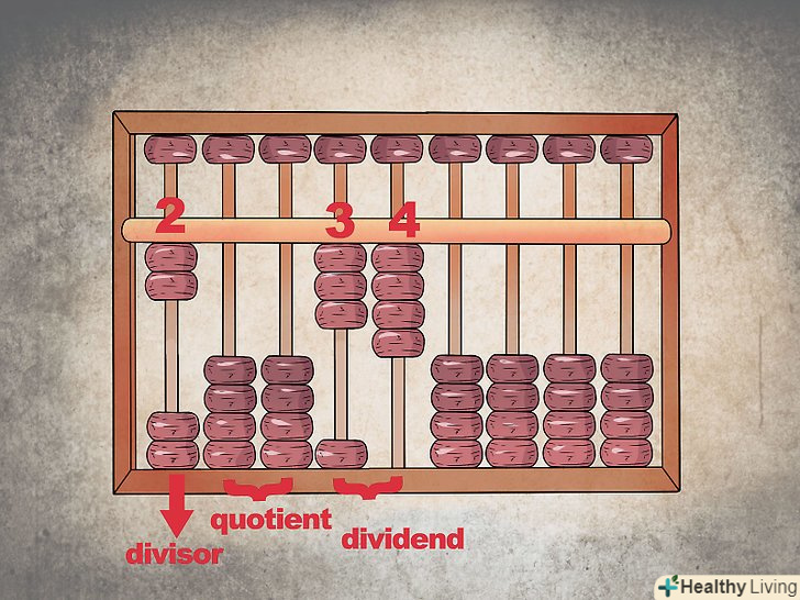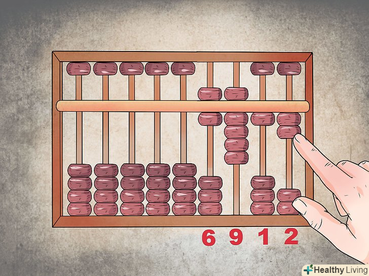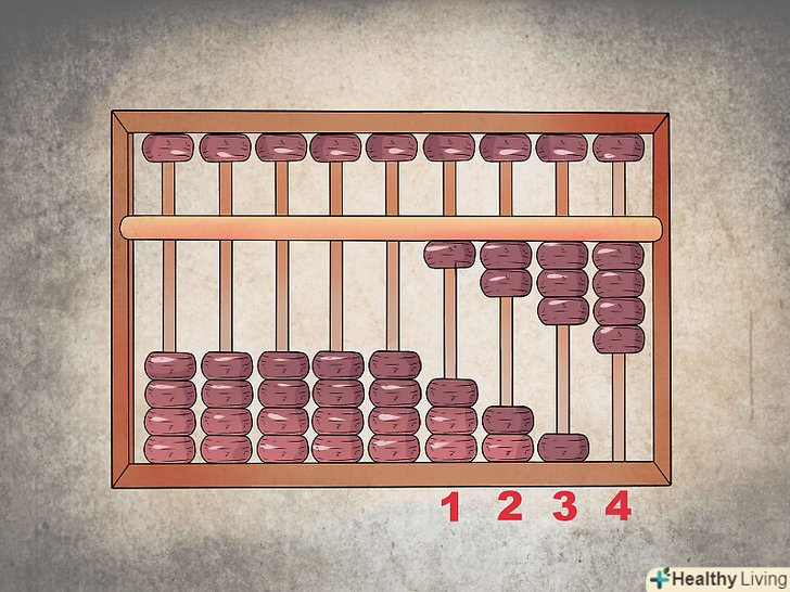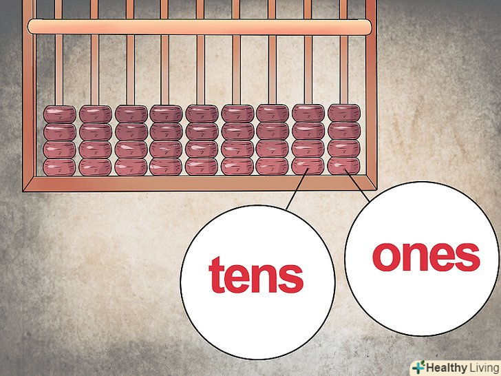Надайте кожному стовпцю числовий розряд.так само як і в сучасному калькуляторі, кожна колонка намистин являє собою розряд, з якого ви починаєте складати число. Так, крайній стовпець праворуч буде розрядом одиниць (1-9), другий ряд праворуч – десятків (10-99), третій праворуч – сотень (100-999), і так далі.- Залежно від ваших розрахунків, Ви також можете додати десяткові позиції, які ви будете відстежувати. Якщо ви хочете набрати число 12 345,67, цифра 7 буде в першому стовпці, 6 – у другому, 5 – в третьому і т.д. проводячи обчислення, просто запам'ятайте, де знаходиться десяткова позиція, зазначивши її на рахунках олівцем, або пропустіть ряд і залиште його порожнім.
