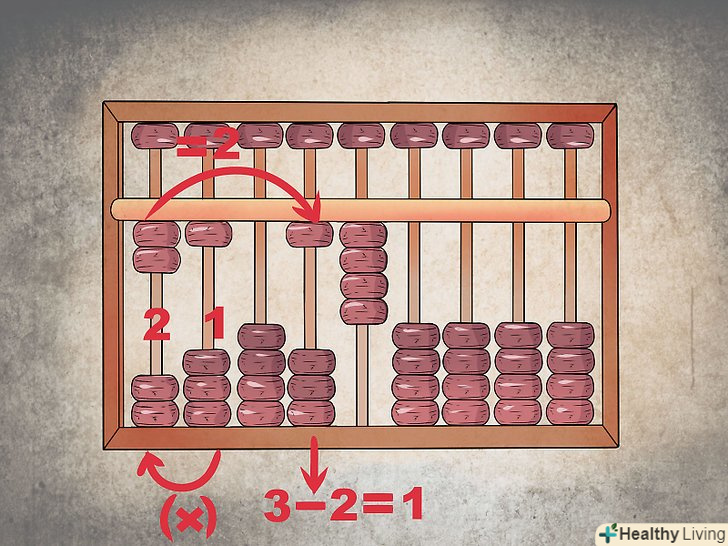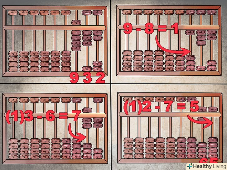 Для віднімання виконайте ту ж процедуру, але в зворотному напрямку.заберіть цифри з попереднього стовпця замість того, щоб переносити їх. Припустимо, ви віднімаєте 867 з 932. Після того, як ви ввели на рахунках 932 (верхня намистина вгорі і чотири нижніх намистин вгорі в стовпці сотень, три нижні намистини вгорі в десятках і 2 нижні намистини вгорі в одиницях), починайте віднімати стовпець за стовпцем зліва.- 9 мінус 8 дорівнює 1, тому залиште одну намистину вгорі в сотнях. У десятках ви не можете відняти 6 з 3, тому заберіть одиницю в сотнях (залишаючи там 0) і відніміть 6 від 13, отримавши 7 в десятках (верхня намистина і 2 нижні намистини знаходяться вгорі). Повторіть те ж саме з одиницями, забираючи намистину з десятків (отримуючи там 6) для віднімання 7 з 12 замість 2. В одиницях має вийти 5: 932 - 867 = 65.