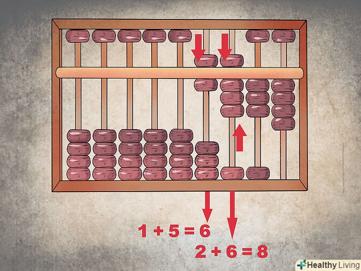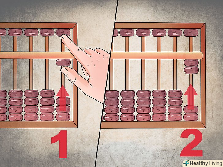 Почніть складати зліва. На відміну від традиційної арифметики, в якій ви починаєте з першої колонки і рухаєтеся вліво, рахунки працюють зліва направо. Так, першими цифрами, які ви будете складати, будуть 1 і 5 в розряді тисяч, тому пересуньте одну намистину верхнього ряду відповідного стовпця вниз, щоб додати 5, і залиште вгорі одну намистину нижнього ряду, щоб отримати 6. Аналогічно, опустіть вниз намистину верхнього ряду в сотнях і підніміть ще одну намистину нижнього ряду, щоб отримати 8 в сотнях.
