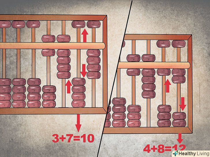 Зробіть "заміну 4 на 5. " [1] Так як в нижньому ряду всього лише чотири намистини, щоб перейти від чотирьох до п'яти, потрібно пересунути намистину в верхньому ряду вниз і перемістити також вниз всі чотири намистини нижнього ряду. Рахунки в цьому положенні правильно читаються як " п'ять."Щоб ввести "шість", пересуньте одну намистину нижнього ряду вгору, таким чином, намистина верхнього ряду знаходиться внизу (позначаючи "п'ять"), і одна намистина нижнього ряду розташована вгорі.- Цей принцип фактично єдиний для всіх розрядів рахунок. Перейдіть з позиції "дев'ять", при якій всі намистини в першому ряду пересунуті вгору, а намистина в верхньому ряду знаходиться внизу, до" десяти", коли піднята єдина намистина нижнього ряду другого розряду.