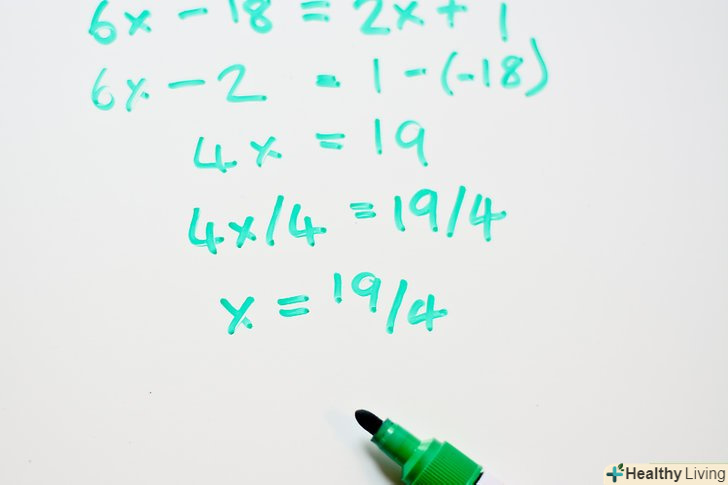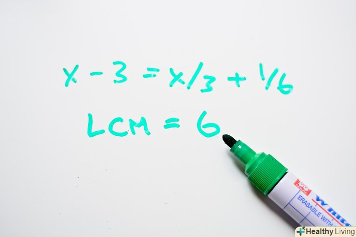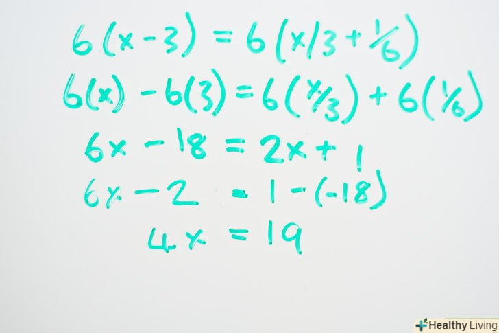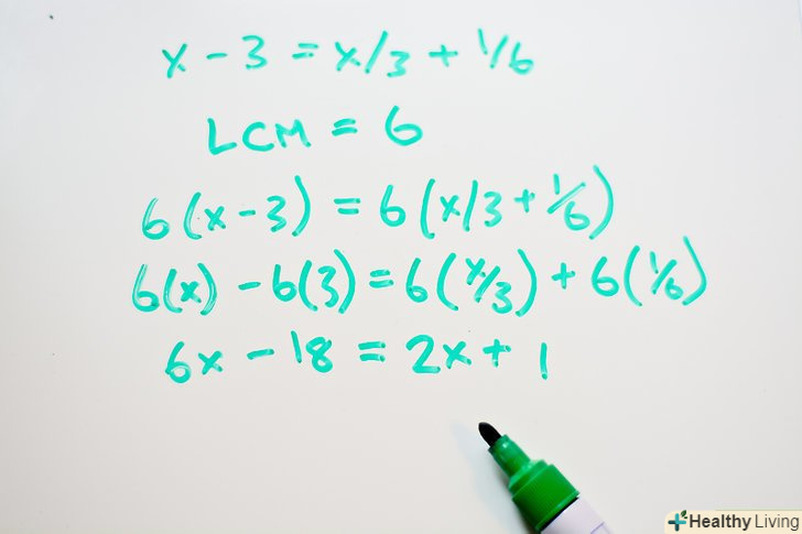 Помножте всі члени рівняння на НОК.тепер укладіть в дужки всі члени вихідного рівняння (на кожній стороні рівняння) і поставте НОК за дужками. Потім перемножте НОК і доданки в дужках. Множення обох частин рівняння на одне і те ж число не змінює кінцевого результату рівняння, але призведе до виду рівняння без дробів.- 6(x - 3) = 6(x/3 + 1/6)