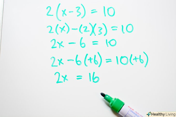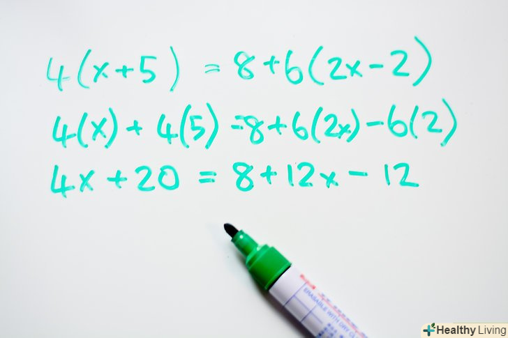 Перемножьте число (член) за дужками і числа (члени) в дужках.помножте число за дужками на перший доданок в дужках, а потім помножте його на другий доданок. Якщо доданків більше ніж два, помножте число за дужками на всі доданки в дужках.[1] Ось як це зробити:- Наприклад: 2 (x - 3) = 10