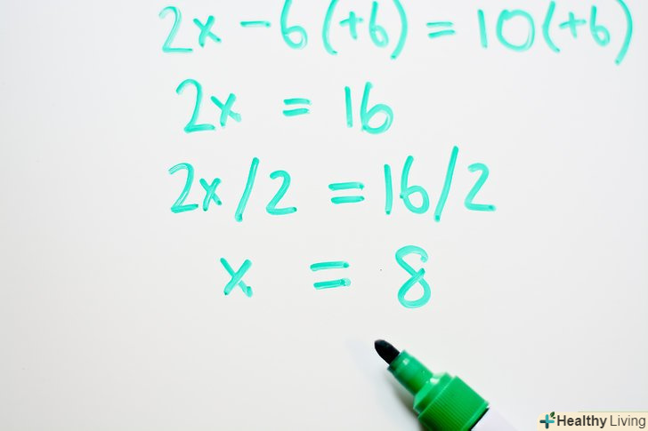 Складіть подібні члени.перш ніж приступити до вирішення рівняння, необхідно скласти подібні члени. Складіть всі вільні члени і члени зі змінною "х". Перенесіть всі вільні члени на одну сторону рівняння, а члени з невідомим – на іншу.- 2x - 6(+6) = 10 (+6)