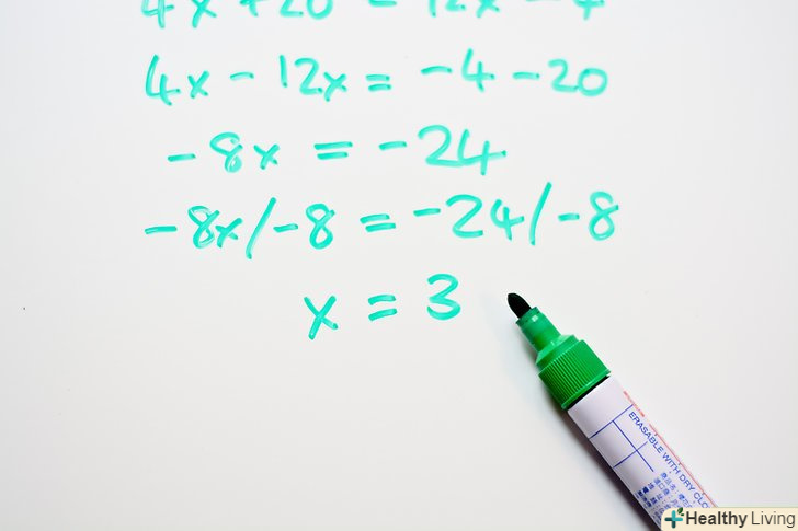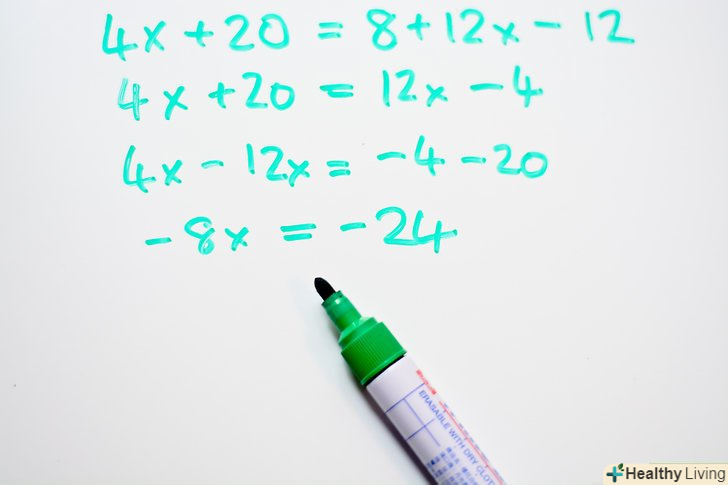 Складіть подібні члени. перенесіть всі вільні члени на одну сторону рівняння, а члени з невідомим – на іншу.- 4x + 20 = 8 +12x -12
