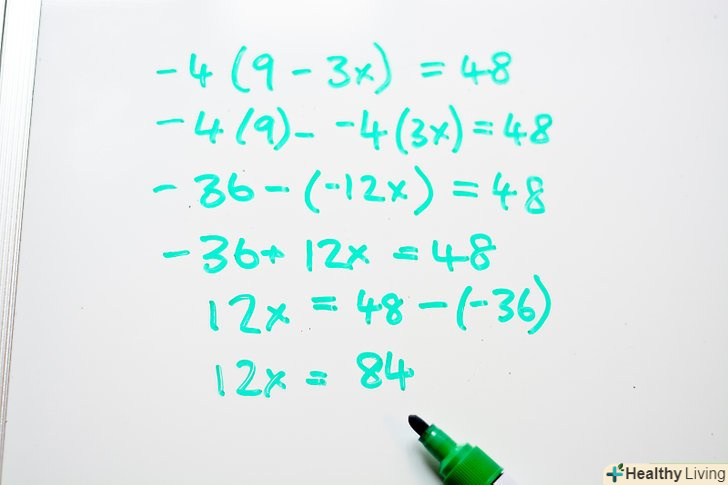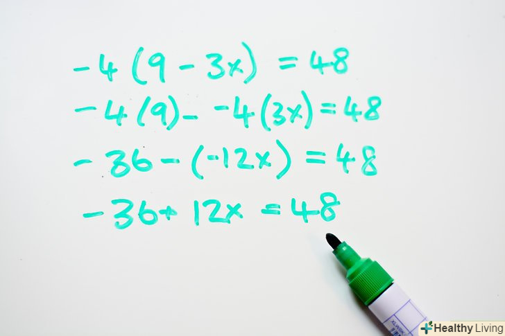 Перемножьте число за дужками і числа в дужках.якщо це число-негативне, то дійте згідно з правилами операцій з негативними числами. Якщо ви множите негативне число на позитивне, то результат негативний; якщо ви множите негативне число на інше негативне число, то результат буде позитивним.[2]- Наприклад: -4 (9 - 3x) = 48