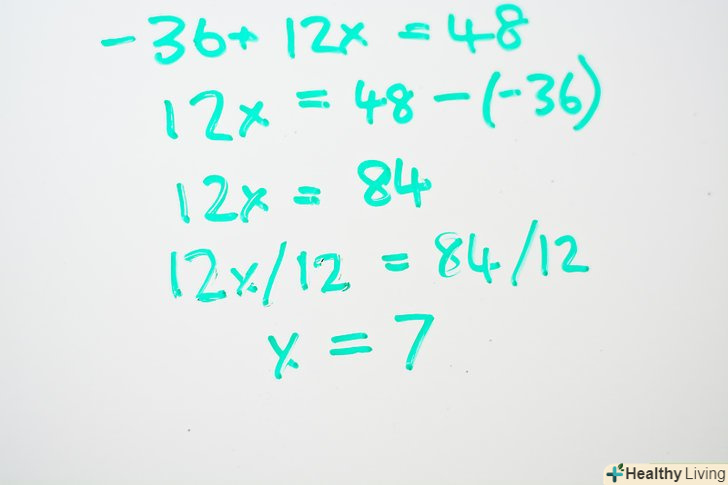 Складіть подібні члени. перенесіть всі вільні члени на одну сторону рівняння, а члени з невідомим – на іншу.- -36 + 12x = 48