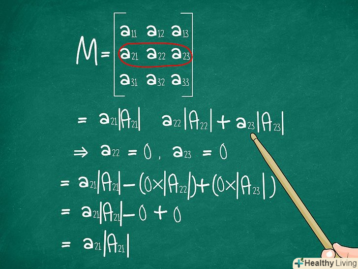 Вибирайте в якості опорного рядка (або стовпця) ту, що має більше нулів.Пам'ятайте, що в якості опорної ви можете вибрати будь-яку рядок або стовпець. Вибір опорного рядка або стовпця не впливає на результат. Якщо ви виберете рядок з найбільшою кількістю нулів, вам доведеться виконувати менше обчислень, оскільки вам буде необхідно обчислити алгебраїчні доповнення тільки для ненульових елементів. Ось чому:- Припустимо, ви вибрали 2 рядок з елементами a21, a22, and a23. Щоб знайти визначник, вам буде необхідно знайти визначники трьох різних матриць розмірністю 2x2. Давайте назвемо їх a21, a22, and A23.