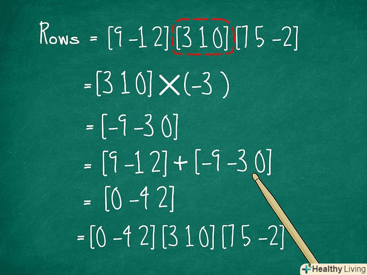 - Щоб позбутися від 9 на місці елемента a11, ми можемо помножити другий рядок на -3 і додати результат до першої. Новий перший рядок буде [9 -1 2] + [-9 -3 0] = [0 -4 2].