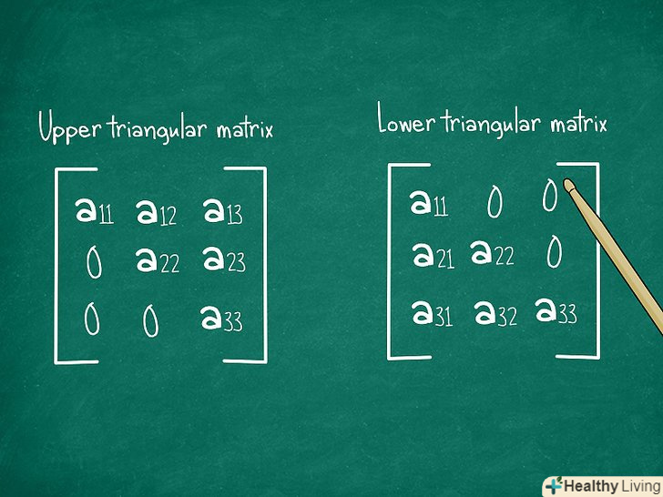 Пам'ятайте, що обчислювати визначник трикутних матриць набагато простіше. визначник трикутних матриць обчислюється як добуток елементів на головній діагоналі, від a 11 у верхньому лівому куті до a33 у нижньому правому куті. Мова в даному випадку йде про трикутних матрицях розмірністю 3x3. Трикутні матриці можуть бути наступних видів, залежно від розташування ненульових значень:[4]- Верхня трикутна матриця: всі ненульові елементи знаходяться на головній діагоналі і вище неї. Всі елементи нижче головної діагоналі дорівнюють нулю.