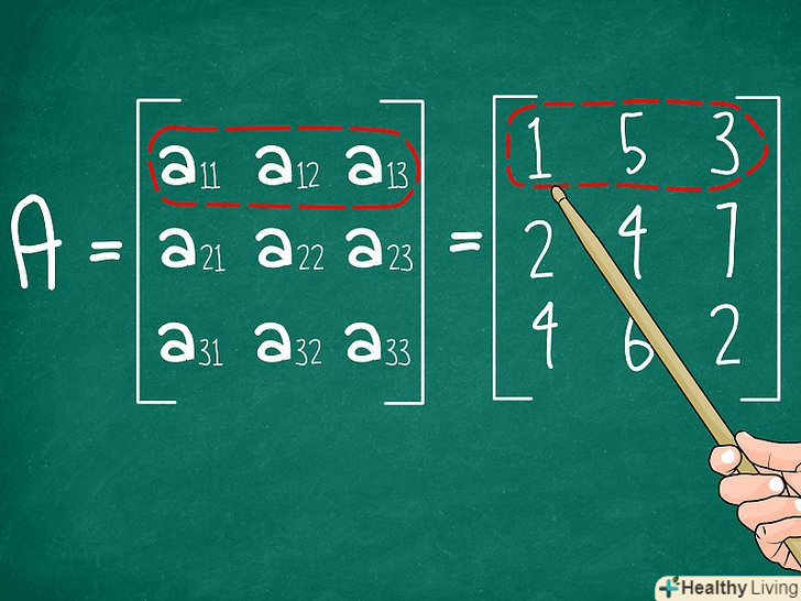 Виберіть рядок або стовпець матриці. цей рядок (або стовпець) буде опорною. Результат буде однаковий, незалежно від того, який рядок або який стовпець ви виберете. В даному прикладі Давайте візьмемо перший рядок. Трохи пізніше ви знайдете кілька порад щодо того, як вибирати рядок або стовпець, щоб спростити обчислення.- Давайте виберемо перший рядок матриці M в нашому прикладі. Обведіть числа 1 5 3. У загальній формі обведіть a11 a12 a13.