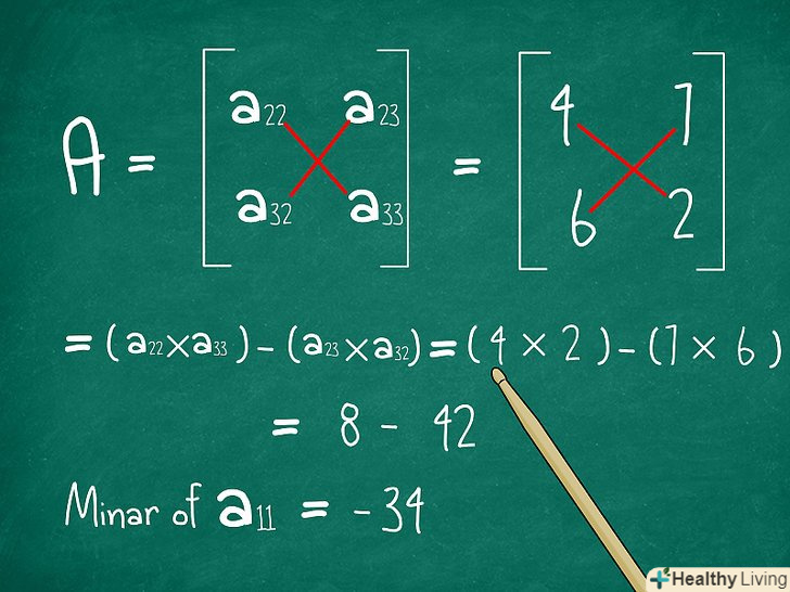 - Цей визначник називаєтьсяМінором елемента, який ми вибрали в нашій первісній матриці.[2] іншими словами, Ми тільки що знайшли мінор a11.