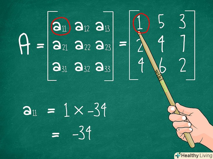 Помножте отриману відповідь на вибраний елемент матриці M. згадайте, який елемент з опорного рядка (або стовпця) ми використовували, коли викреслювали інші елементи рядка і стовпця, щоб отримати нову матрицю. Помножте цей елемент на отриманий мінор (визначник матриці 2x2, яку ми позначили X).- У нашому прикладі ми вибирали елемент a11, який дорівнював 1. Помножимо його на -34 (визначник матриці 2x2), і у нас вийде 1*-34 = -34.
