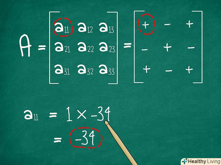 Визначте знак отриманого результату.далі вам знадобиться помножити отриманий результат на 1, або на -1, щоб отримати алгебраїчне доповнення (кофактор) вибраного елемента. Знак кофактора буде залежати від того, в якому місці матриці 3x3 стоїть елемент. Запам'ятайте цю просту схему знаків, щоб знати знак кофактора:- + - +